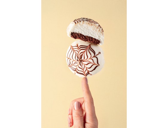 DESCRIPTION: A light and airy cream soufflé with a hint of cheesecake flavor, set on a rich chocolate sponge cake and coated in a smooth white chocolate glaze. Best served chilled.